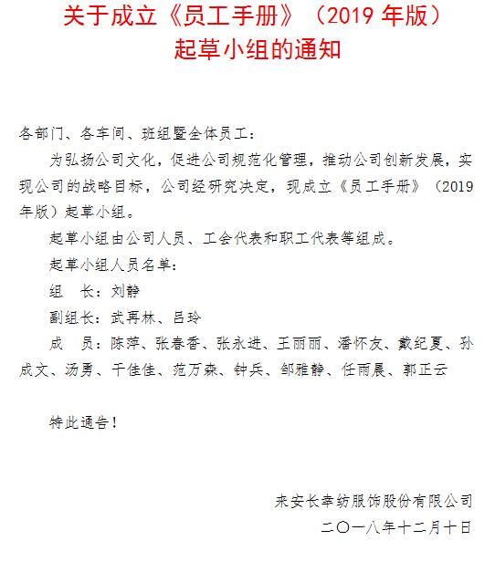 夏少文律師其次宣講了來安長幸紡服飾股份有限公司《員工手冊》(2019年版)草案具體內容有公司簡介及理念、企業文化、組織機構、員工要求、員工義務、員工權利、獎懲條例、考勤管理、員工福利等與員工息息相關內容。并對主要章節進行了的解釋說明,以便大家更好領會員工手冊精神和員工手冊內容。
